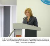 Н.М. Золотарева, директор Департамента государственной политики в сфере подготовки рабочих кадров и ДПО Министерства образования и науки Российской Федерации, касалась вопросов качества дошкольного, общего и профессионального образования, плана реализации проекта WorldSkills Russia в